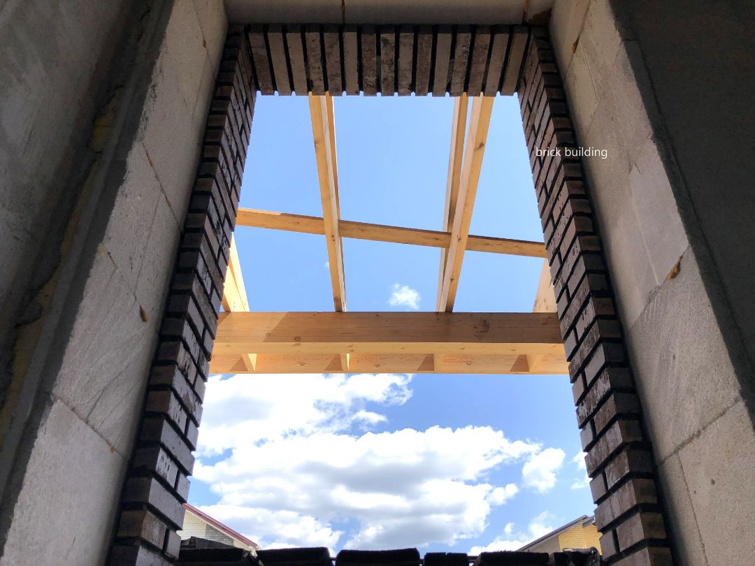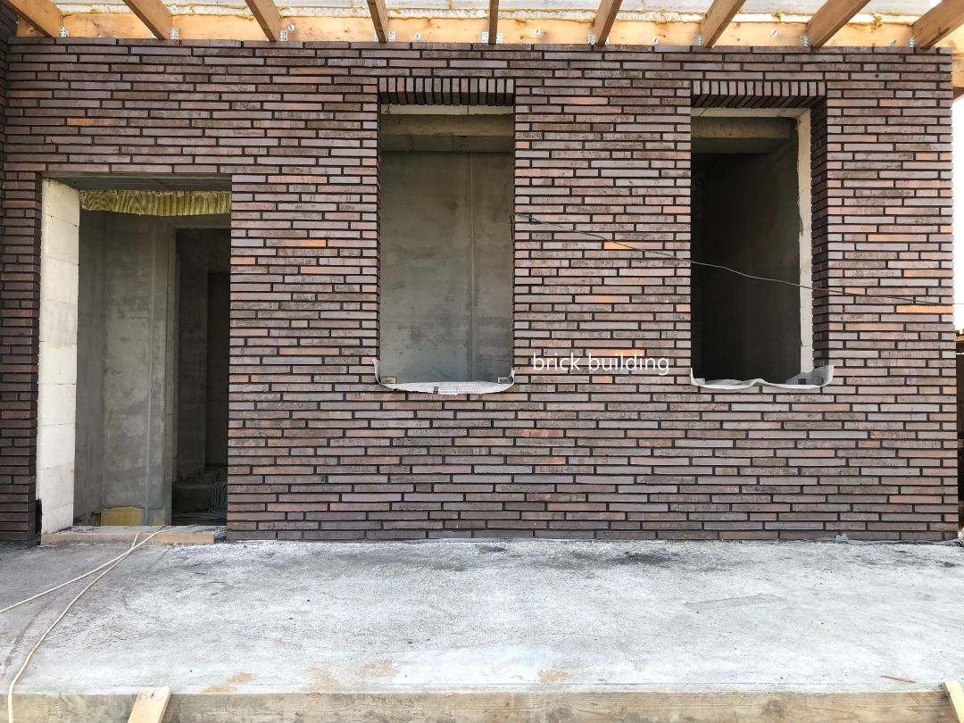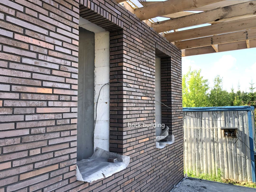 Для основной кладки ригельного кирпича была выбрана хаотичная раскладка со вставками частей разной длины. Перемычки сделаны в виде обрамления с кирпичом на ребро. На откосах кладка кирпича с перевязкой на 1/3 кирпича.