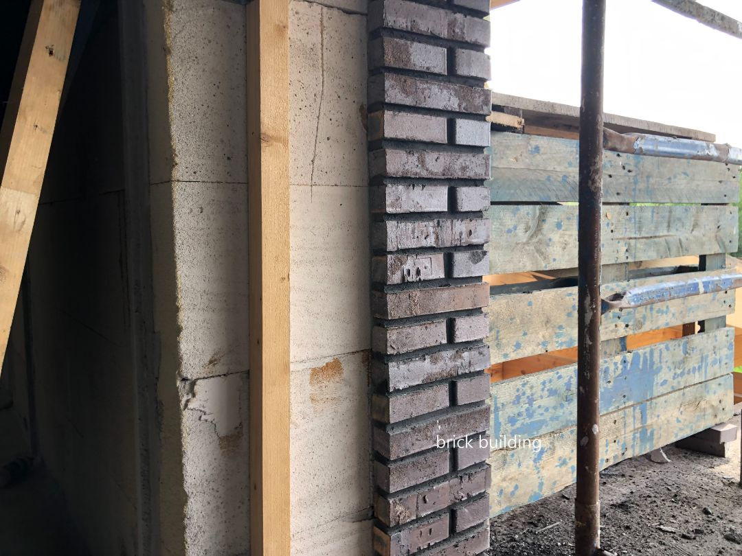Для кладки ригельного кирпича была выбрана плоская расшивка швов шириной 12 мм с заглублением 8 мм.. До начала кладки был сделан образец (мокап) с хаотичной кладкой риегельного кирпича.