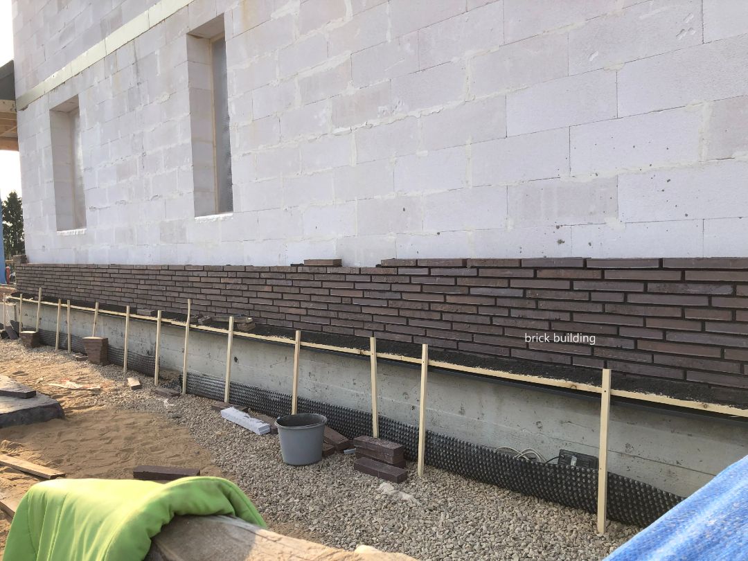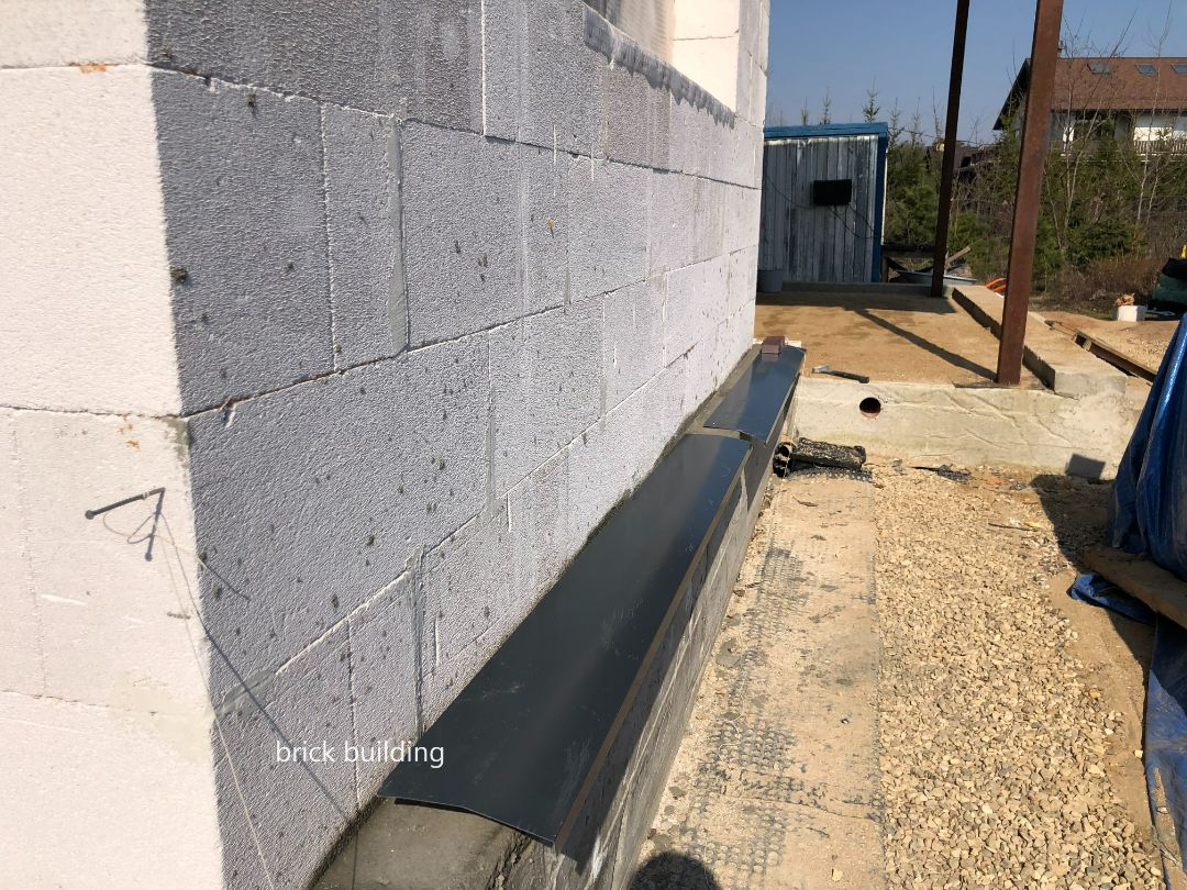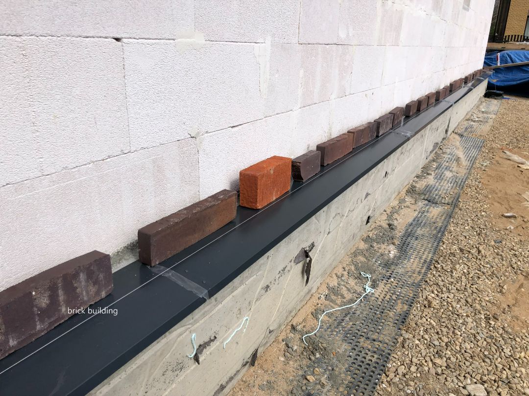 Отлив смонтирован до начала лицевой кладки кирпича (внутренний монтаж отлива), поэтому кладка ригельного кирпича велась поверх отлива. Отлив был закрыт прокладкой и доской, чтобы в процессе работ исключить его повреждение. Расстояние капельника до утеплителя сделали 35 мм для отделки плиткой утеплителя.