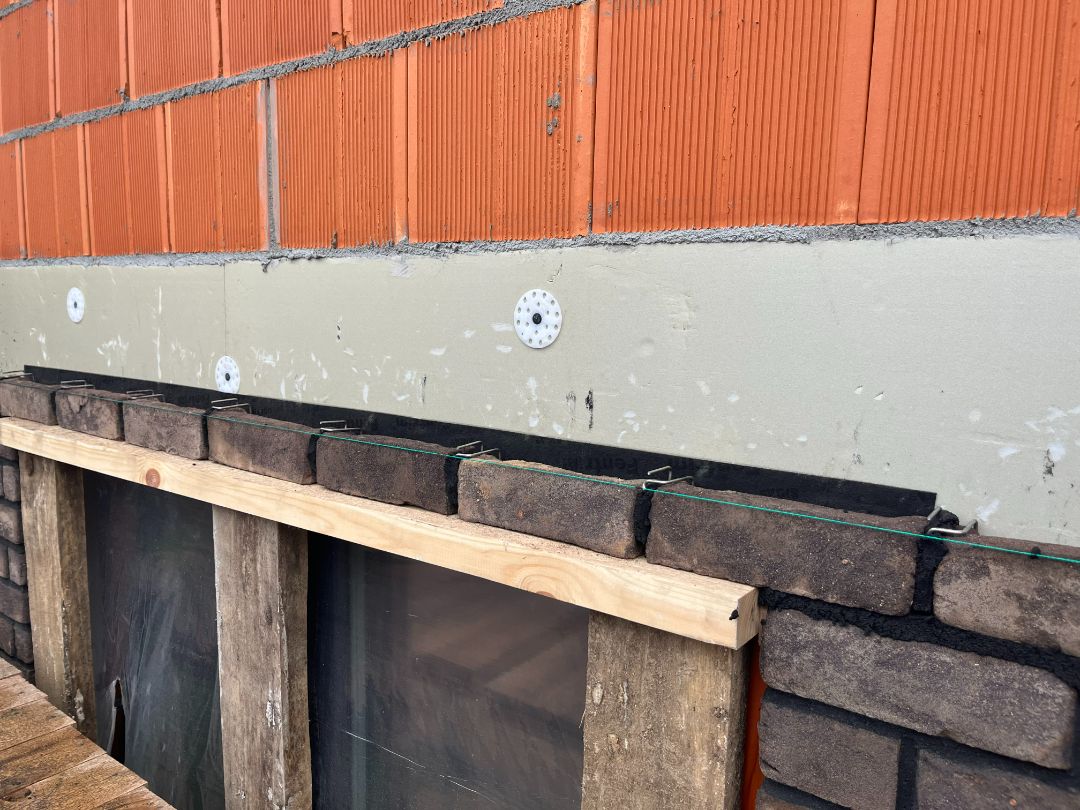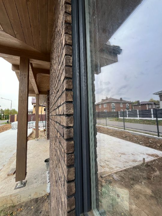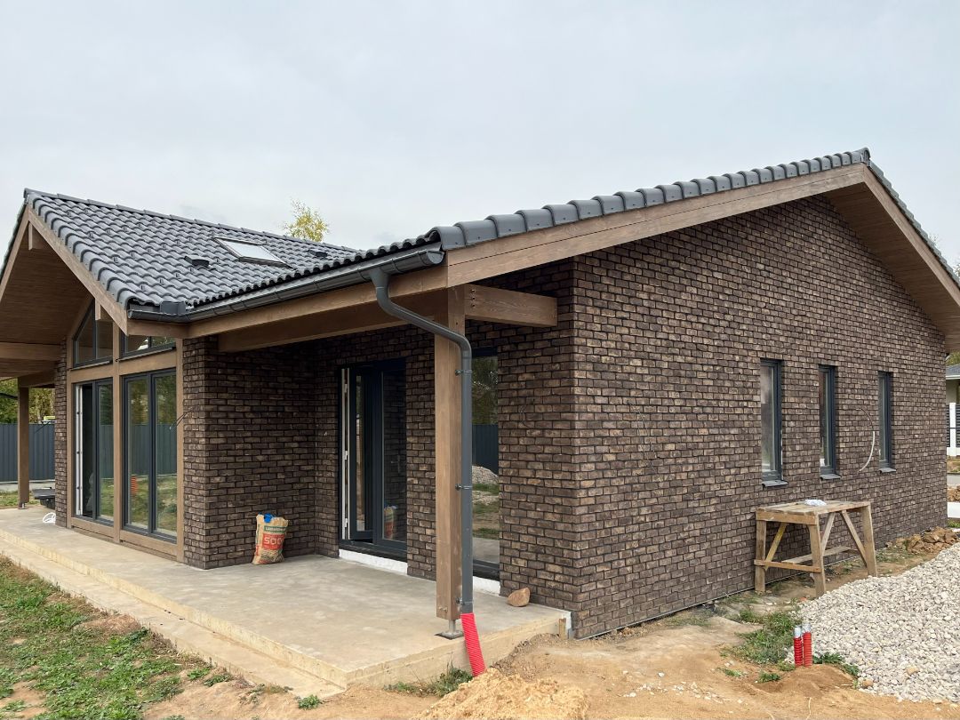 На фасаде кирпич хорошо перекликается с деревянными элементами, а графитово-чёрные кладочные швы из смеси от завода Quick-mix отлично сочетаются с кровлей, оконными рамами и водосточной системой, что создаёт общую визуальную гармонию.