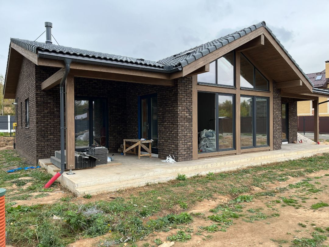 В лаконичный проект одноэтажного дома нам хотелось привнести что-то особенное и в то же время создать элегантность, в этом нам помог кирпич ручной формовки Faber Jar Петровский штандарт. Простые внешние формы дома с этим кирпичом стали более интересные, а фасад в целом располагает к себе.