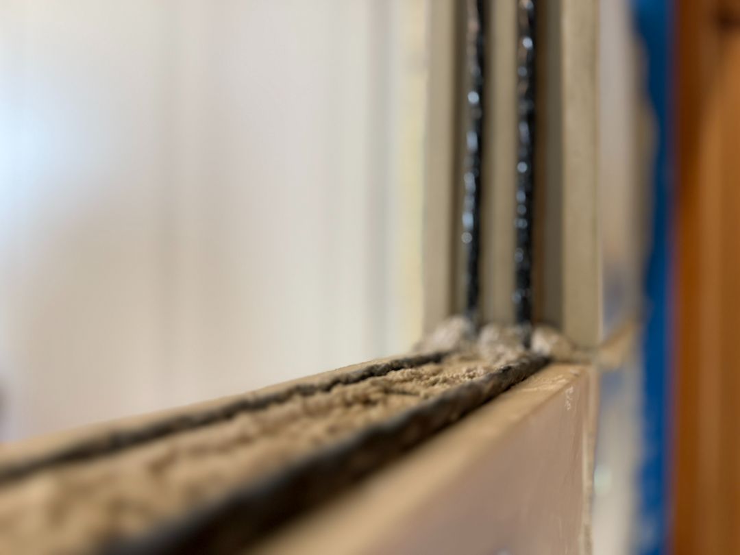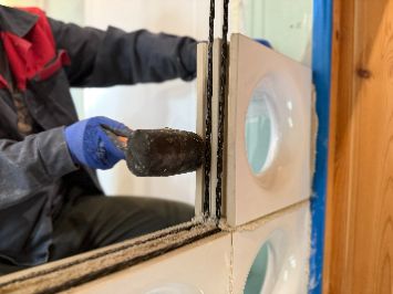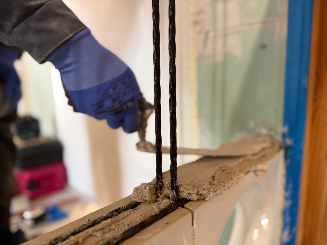 В кладке применили смесь для материала с низким водопоглощением. В швы кладки блоков были заложены специальные армирующие стержни для повышения прочности конструкции, а в качестве связей со стеной и боковым брусом использовали металлические уголки.