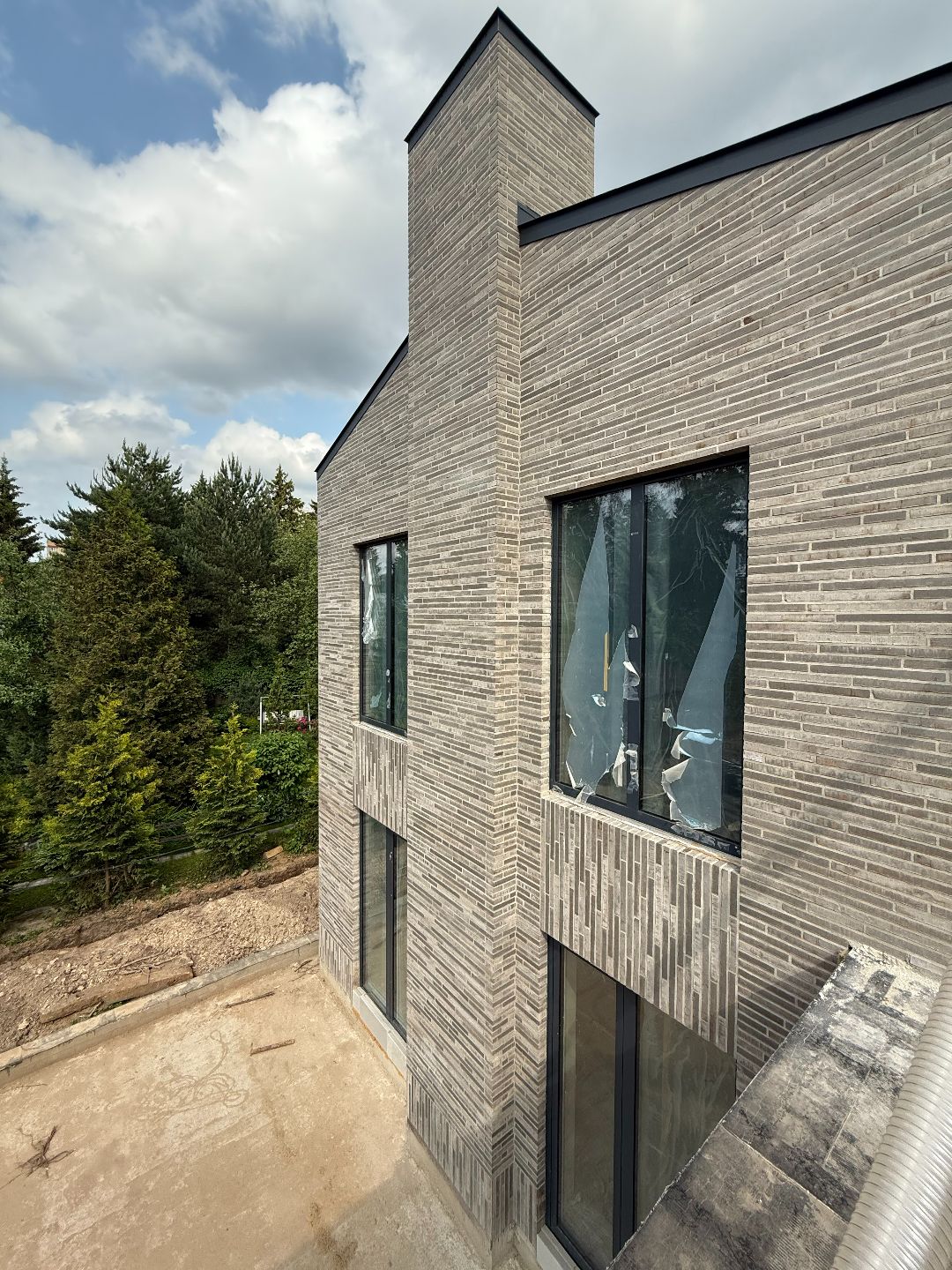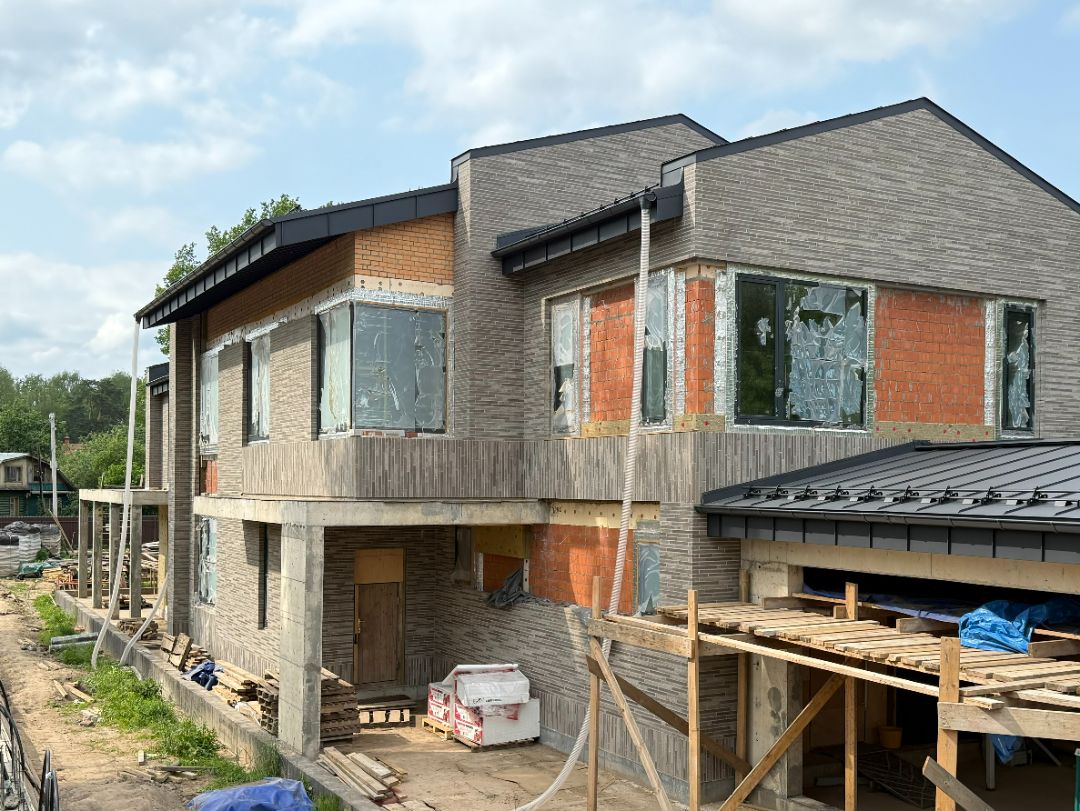 Через несколько дней мы привезли небольшое количество кирпича и кладочной смеси на объект для выкладки образца, который потом одобрил заказчик. На фасаде есть вертикальная кирпичная кладка и много узких участков, поэтому нам нужно было учесть эти особенности при разработке и реализации образца. В итоге мы выбрали хаотичную раскладку со вставками разной длины и плоскую расшивку швов с минимальным заглублением, чтобы не открывать места спила у кирпича.